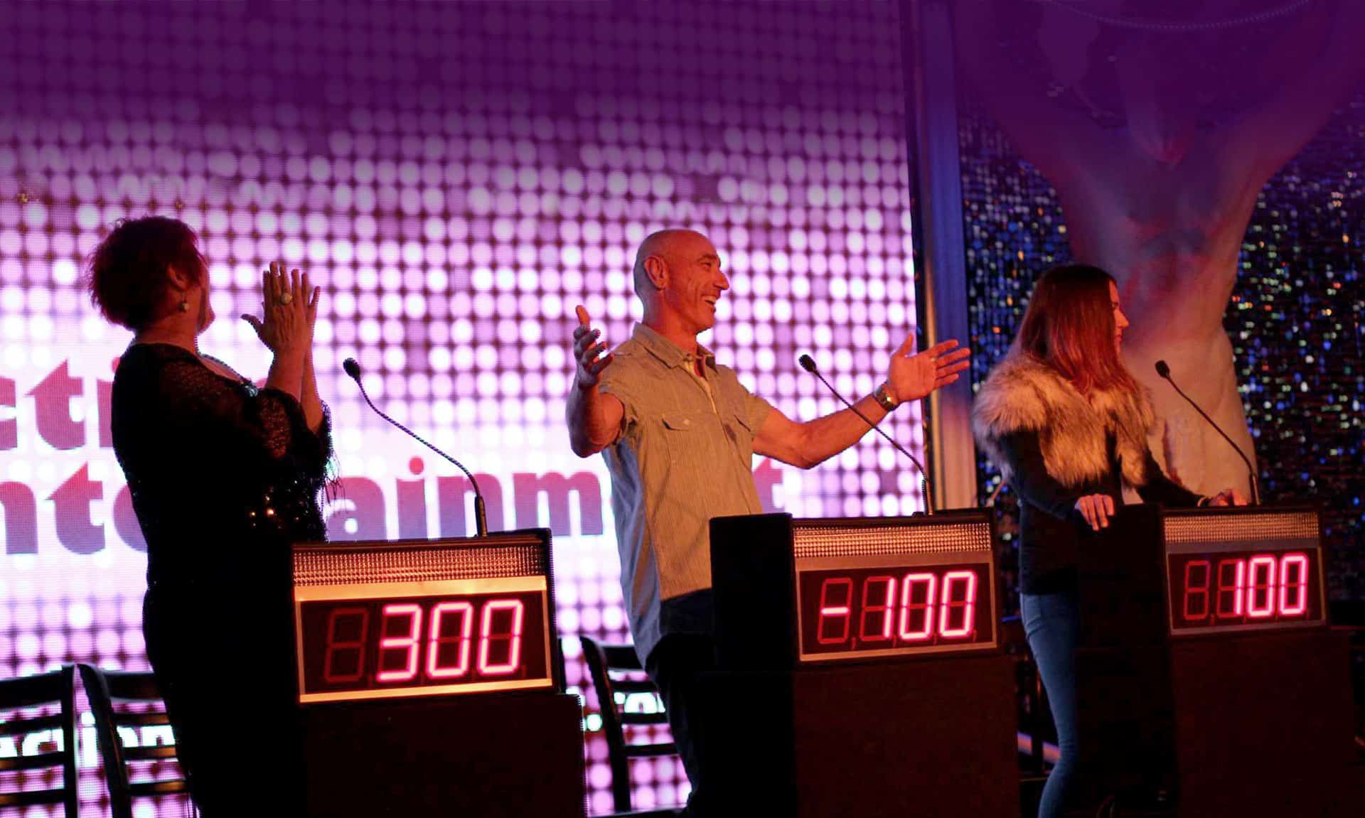 Complete with buzzers, podiums, sound cues, digital score boards and all the bells and whistles you’d expect, the show features all the glitz, glamour and grandeur of a live TV game show. The show can integrate company, industry or theme-specific questions to suit your event and includes trivia, general knowledge and sound-clip questions as well as hilarious comic challenges.